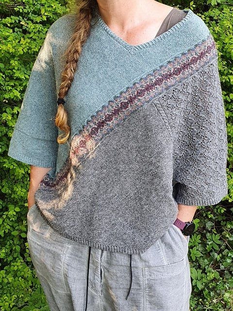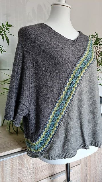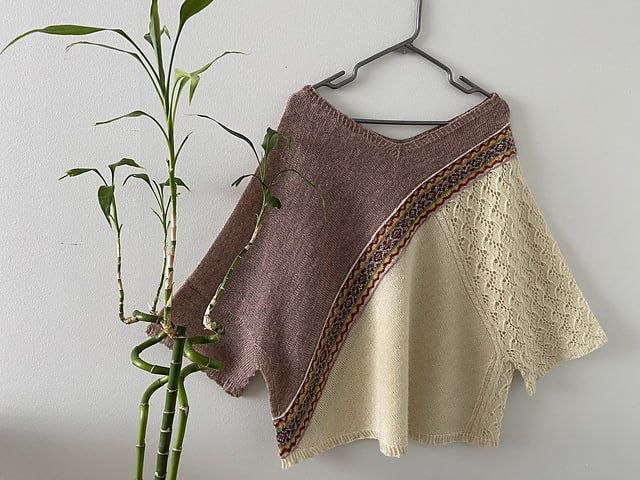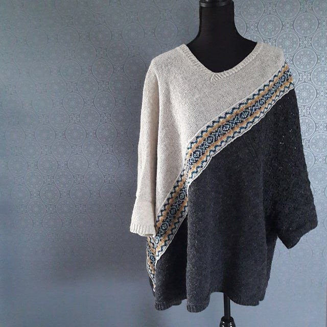 В Атлантический Канаде Барашуа - это лагуна, отделенная от океана галькой или скалой (песчаная полоса редкость для этих мест!). Барашуа послужила источником вдохновения для этого джемпера свободного кроя в стиле пончо. Сначала выполняется полоса жаккарда по кругу. Затем петли поднять с обеих сторон этой полосы и продолжать в разных направлениях лицевой гладью и ажурным узором.