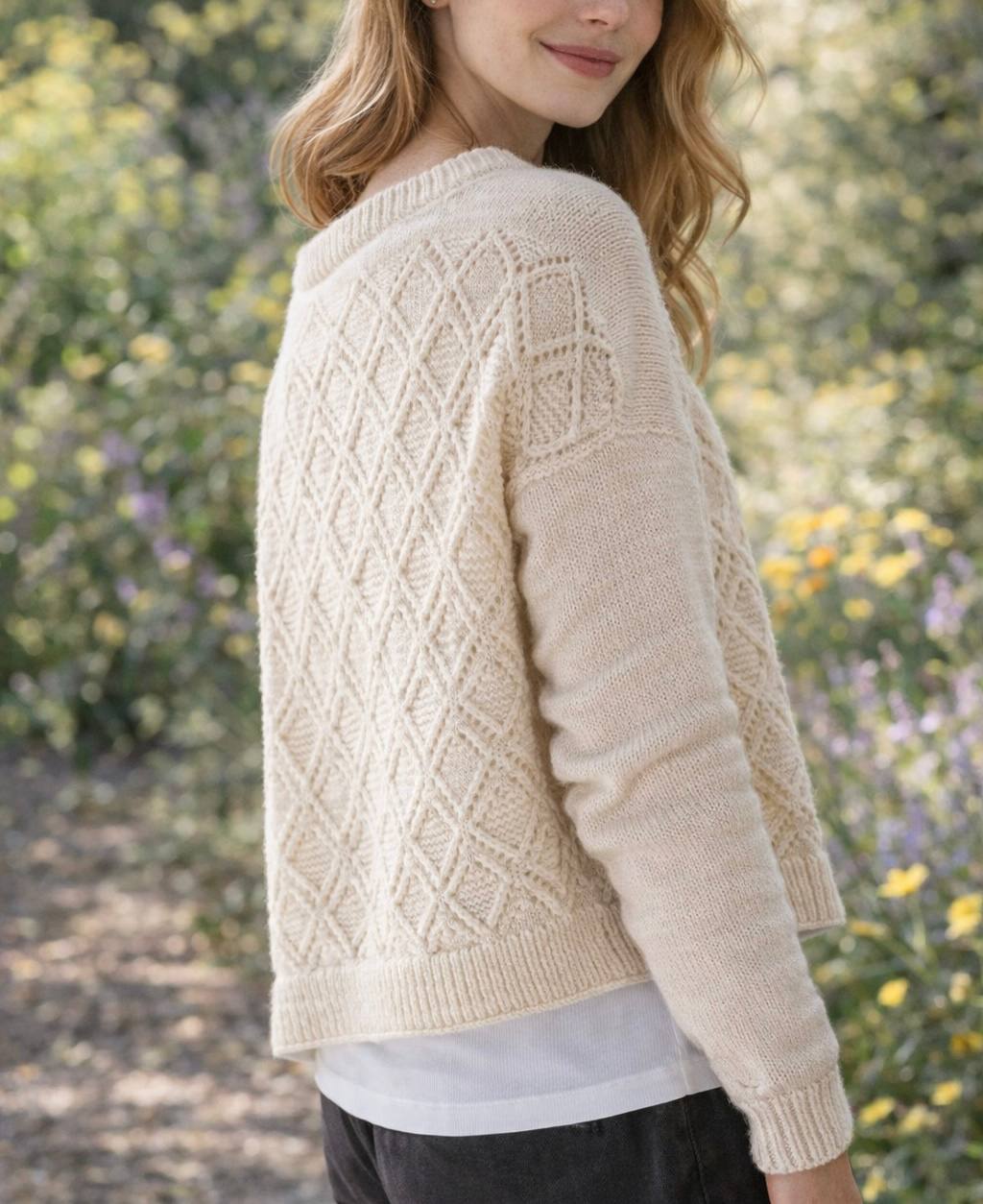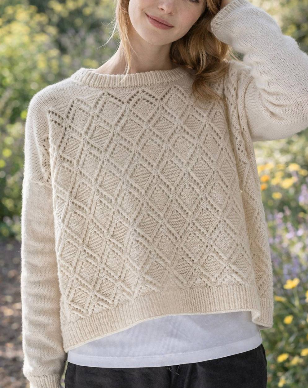 Ажурный джемпер с геометрическим узором, элегантный и уютный в натуральном молочном оттенке, который покоряет с первого взгляда своей фактурой и лаконичностью. Центральная часть выполнена выразительным геометрическим ажуром в виде ромбов, создающим эффект ручной работы высокого уровня. Прямой свободный силуэт и классический круглый вырез делают модель универсальной и комфортной для повседневной носки. Гладкие рукава и аккуратная резинка по низу и горловине красиво уравновешивают ажур, подчёркивая чистоту линий. Джемпер легко впишется в гардероб в стиле casual, minimal или boho, отлично сочетается с юбками, брюками и джинсами.