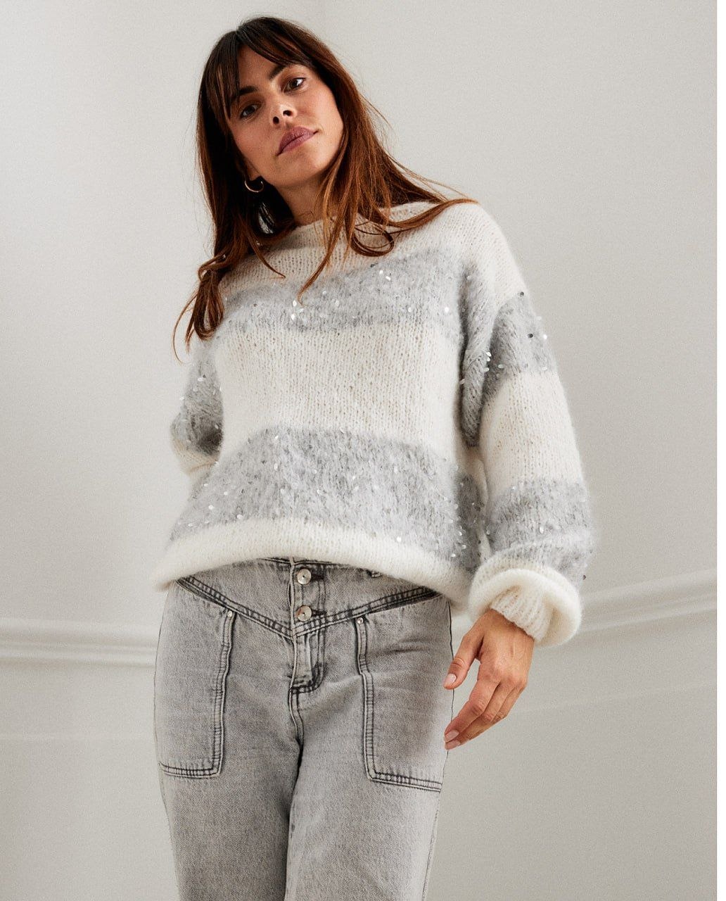Создайте стильный и уютный джемпер, который выглядит как из бутика. Эта модель - идеальный баланс между комфортом, трендом и легкой нарядностью. Почему вам понравится этот джемпер: актуальный оверсайз силуэт - свободно сидит и подходит под любой образ; нежный градиент из мягких оттенков деликатное мерцание за счёт пайеток; универсальная модель - отлично сочетается с джинсами, юбками и классическими брюками.