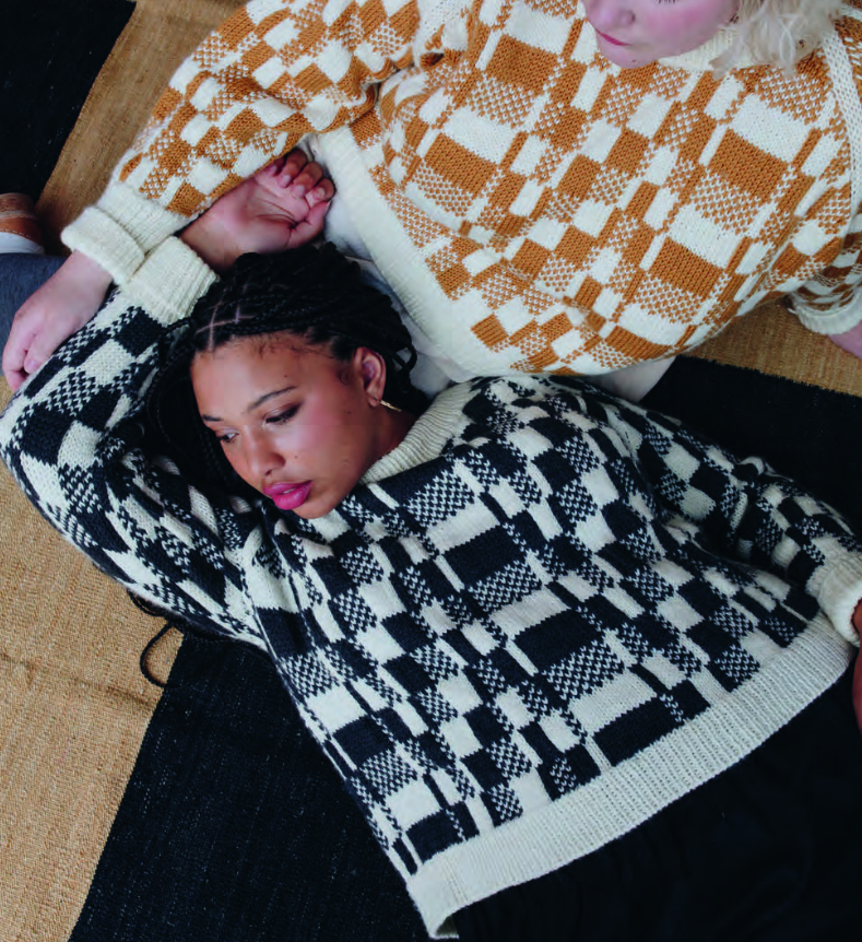 "Polyrhythm" - это бесшовный джемпер свободного кроя с рукавами реглан, который вяжется no кругу снизу вверх сплошным двухцветным узором. Горловина переда вяжется поворотными рядами и формируется за счет убавок.