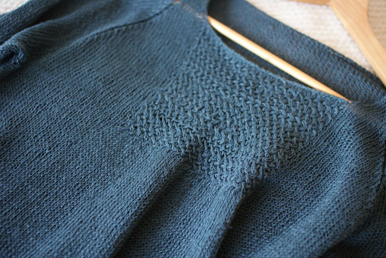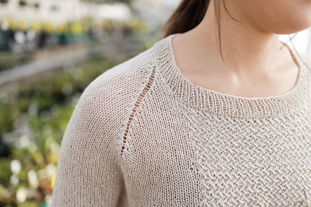 Джемпер вяжется по кругу снизу вверх с формированием А-образной линии тела и регланами на кокетке. Панель переда вяжется одновременно с формированием кокетки, что позволяет получить складки по переду.