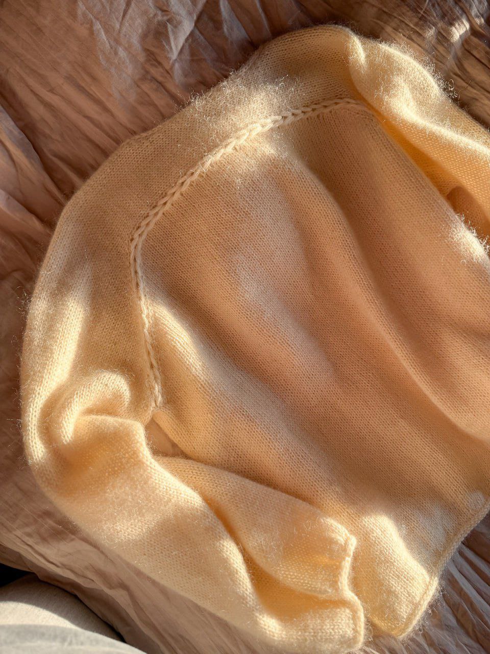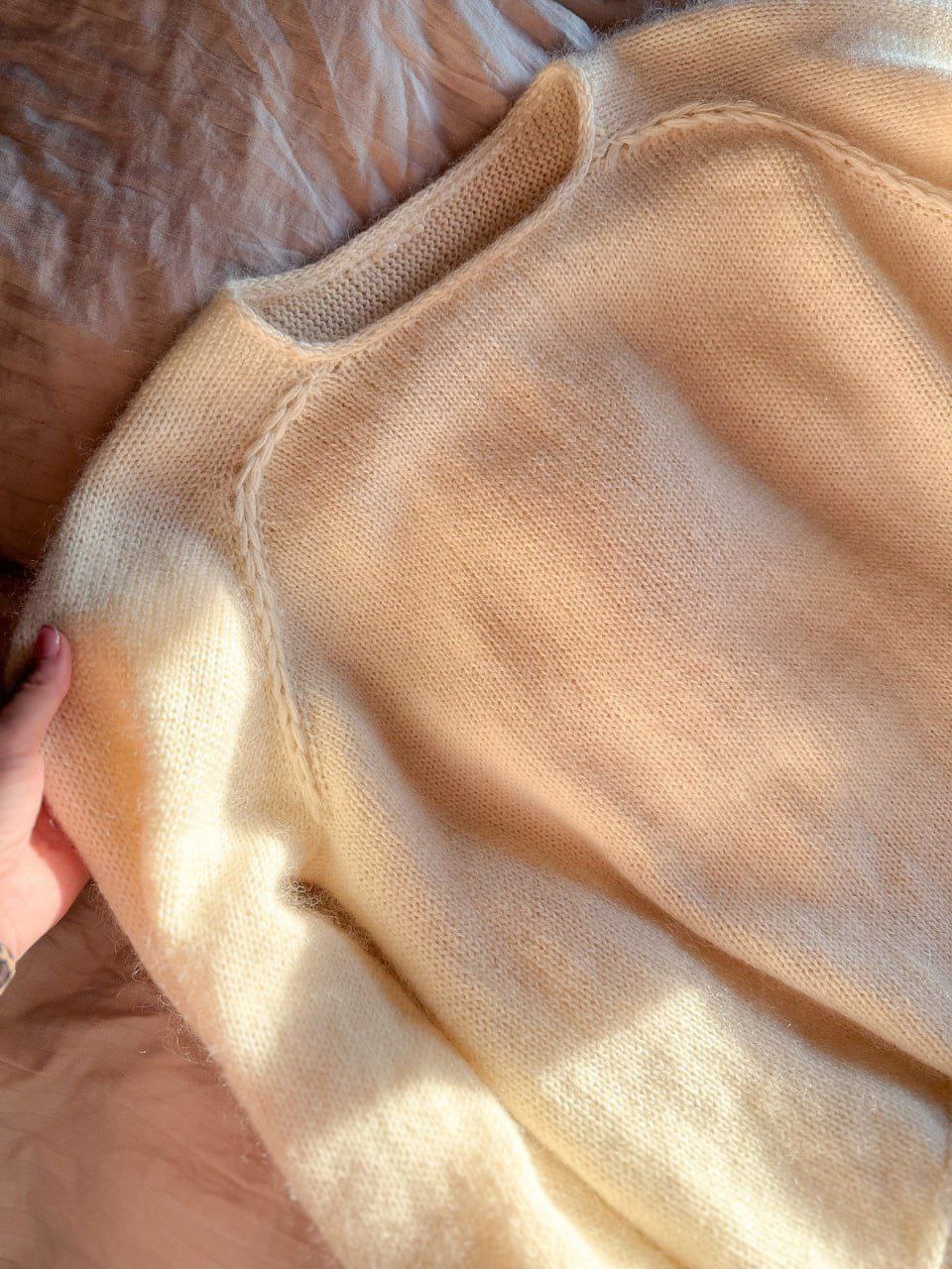 Джемпер вяжется в две нити: 100% меринос метражом в 100 граммах 400 метров и кидмохер на шелке метражом в 25 граммах 210 метров.