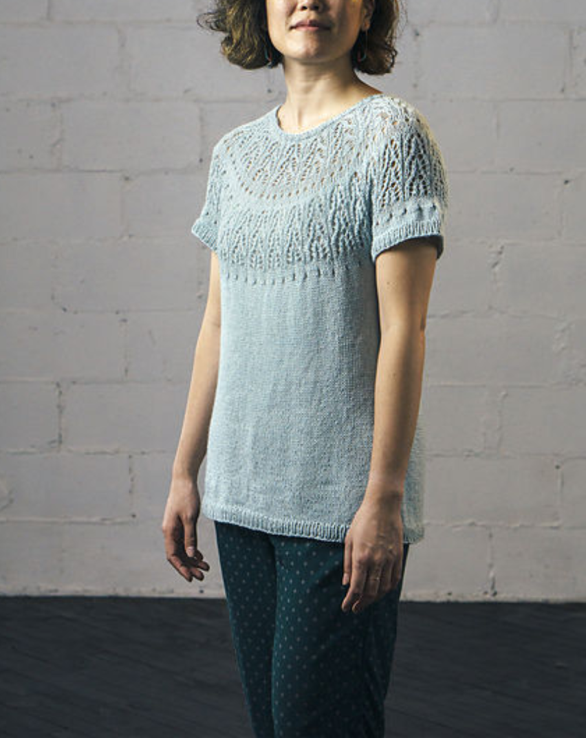 Изящная, легкая и невероятно женственная футболка с ажурной круглой кокеткой - идеальный проект для теплого сезона. Выглядит утонченно и вяжется с удовольствием, без сложных конструкций и с понятной логикой процесса.