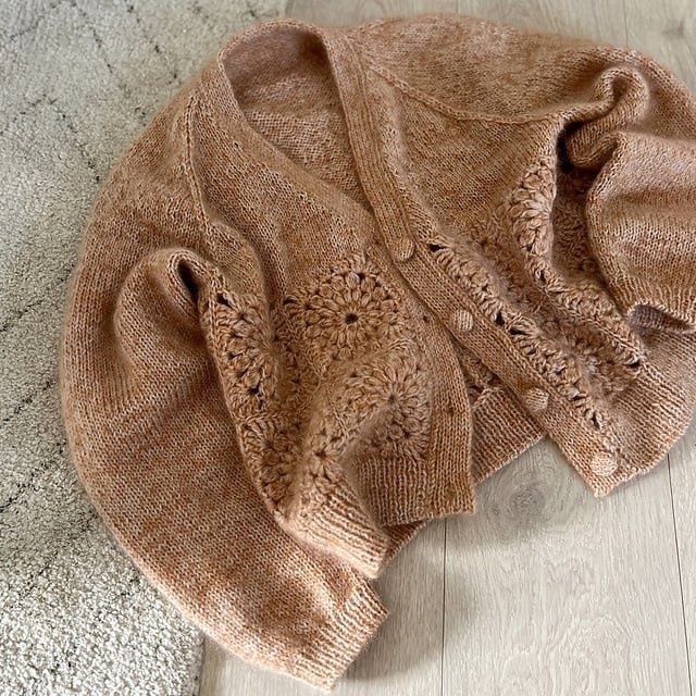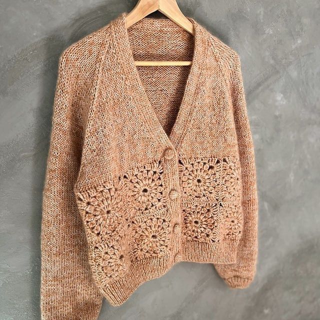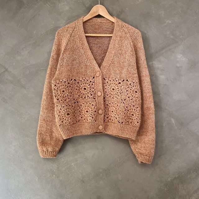 Кардиган состоит из сшитых вместе бабушкиных квадратов, связанных крючком. Верх кардигана связан спицами лицевой гладью. Тело и рукава соединяются по регланам.