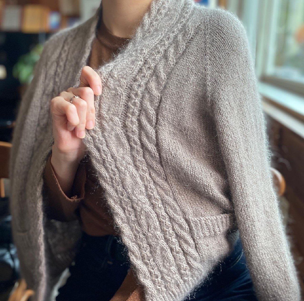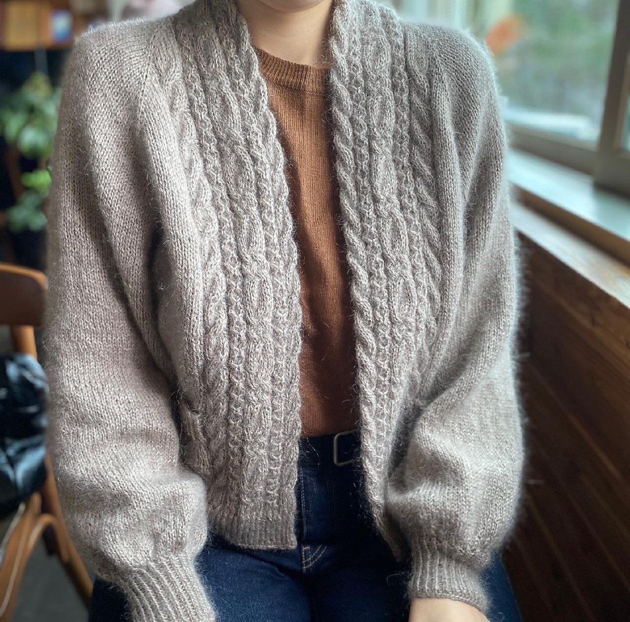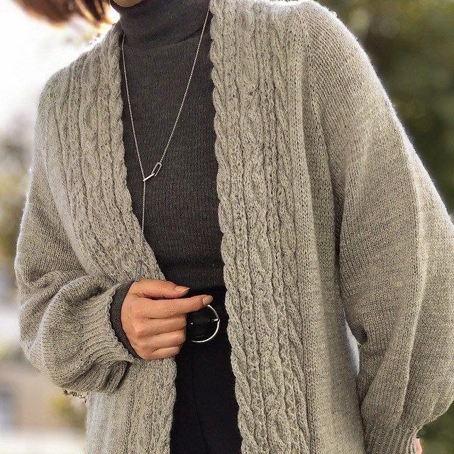 Кардиган свободной посадки оверсайз вяжется без швов сверху вниз одной деталью.