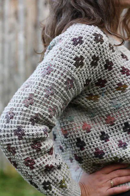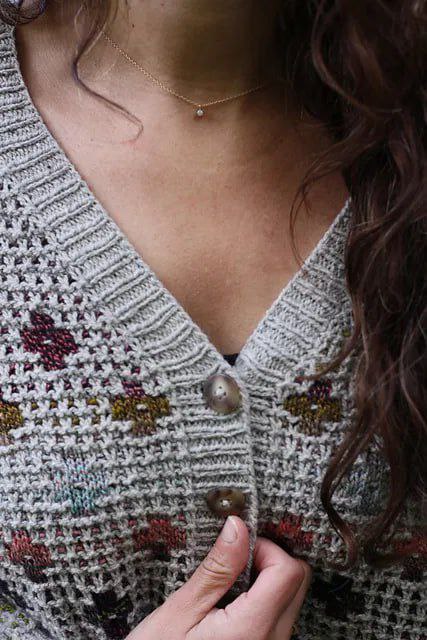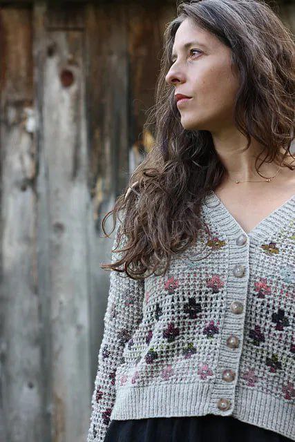 Элегантный кардиган спицами с деликатным цветочным узором - идеальное сочетание уюта, женственности и натуральной эстетики. Модель выполнена в спокойной природной гамме с мягкими вкраплениями оттенков, создающих эффект ручной работы и лёгкой винтажности.