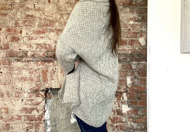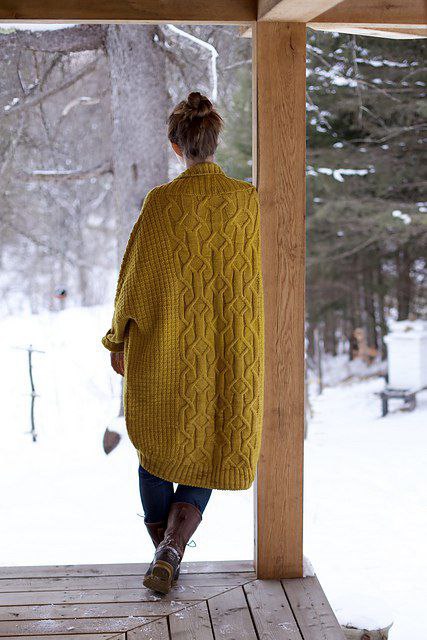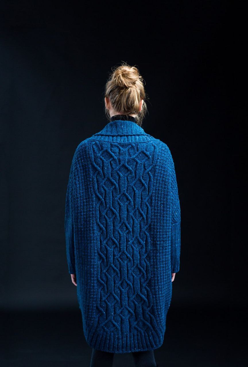 Текстурный узор сочетается в этом великолепном пальто в драматическом стиле с объемным волнообразным узором на спинке. На нижней части спинки формируются укороченные ряды для создания красивого изгиба, удлиняющего полотно спинки с четкими панелями разветвляющихся кос, смещающихся к мотиву вафельного узора среди рубчиков и складок. Убавки внутри воротника, связанного резинкой обеспечивают посадку пальто по плечам, в конце на полочках вяжут планки двойной резинкой. Спущенные рукава связаны платочной резинкой и придают изделию дополнительную изюминку.