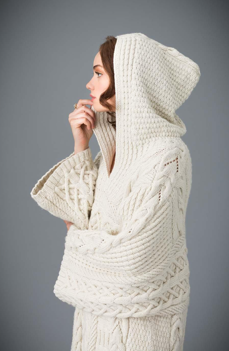 Объемный пуловер с капюшоном, связан в различных направлениях с использованием множества текстурных узоров и аранов.
