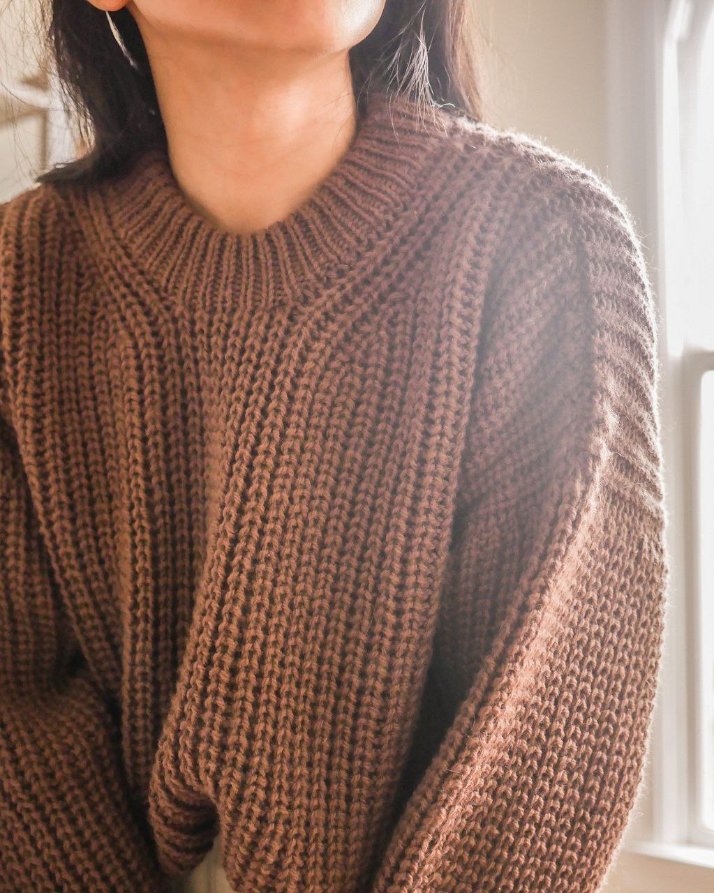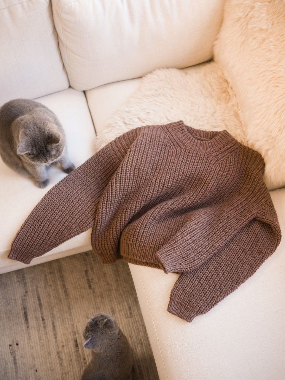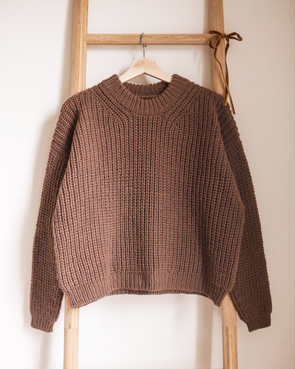 Пуловер спицами "Emerson" вяжется узором полубриошь, без швов, сверху вниз. Петли для воротника и рукавов поднимаются после завершения тела пуловера.