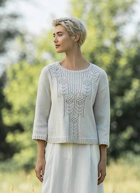 Этот пуловер со спущенными плечами выполнен снизу вверх отдельными деталями и сшит. Цветочный узор, слегка А-образный силуэт и рукава-колокольчики длиной три четверти делают его идеальным для лета.