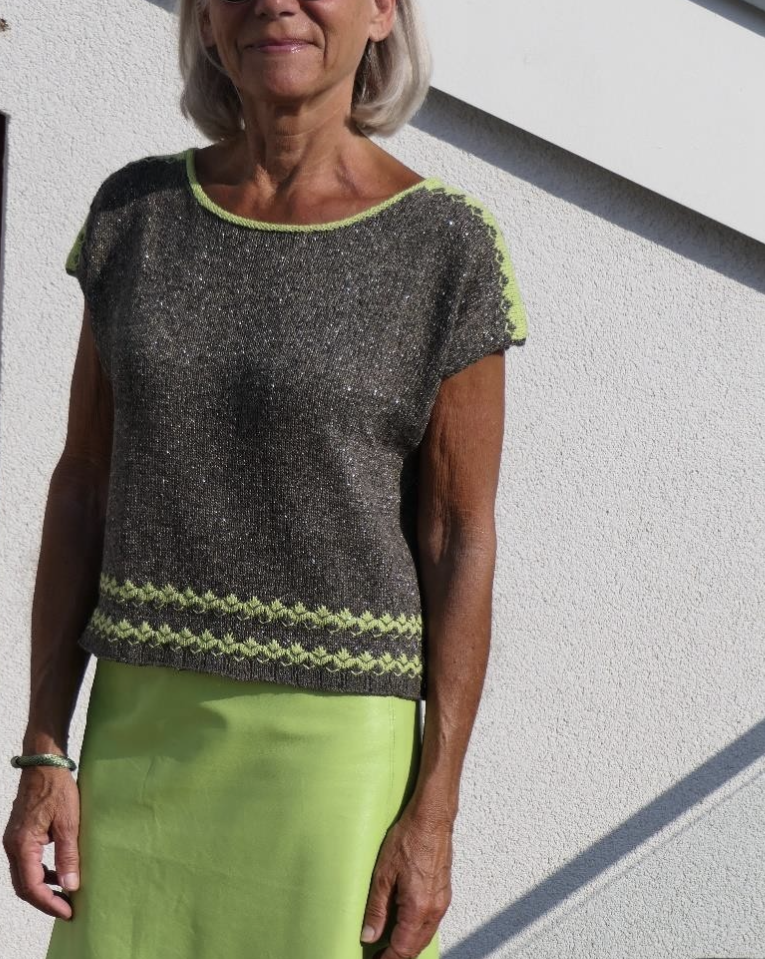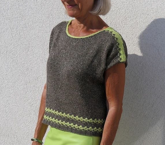 Это топ оверсайз прекрасно подойдет для летних солнечных дней. Вязание начинается снизу и продолжается круговыми рядами до пройм. Затем работа делится на перед и спинку, которые вяжутся раздельно поворотными рядами до плеч. Линия плеч и вырез спинки формируются при помощи укороченных рядов, а вырез горловины переда образуется благодаря убавлениям и закрытым петлям. По окончании работы выплоняют отделку горловины.