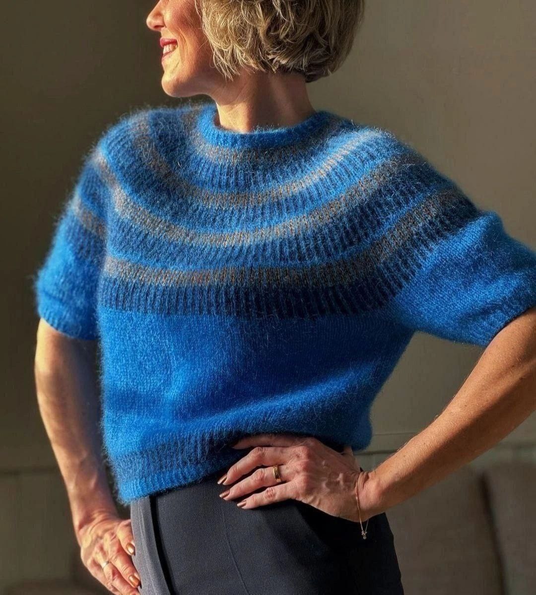 "Tanne" - это топ с короткими рукавами, который вяжется сверху вниз. Край горловины обработан итальянским набором петель, за которой следуют резинка со скрещенными петлями и круглая кокетка, выполненная в виде рельефного узора. Перед разделением кокетки на тело и рукава вяжутся укороченные ряды, чтобы сформировать росток. Жаккардовый узор выполняется только с лицевой стороны, поэтому этот дизайн - хороший проект для вязальщицы, не имеющей большого опыта в жаккардовом вязании. Если вы хотите ещё упростить этот дизайн, итальянский набор петель можно заменить обычным, классическим, набором петель. Только следите за тем, чтобы не стянуть край. Итальянское закрытие петель также может быть заменен обычным.