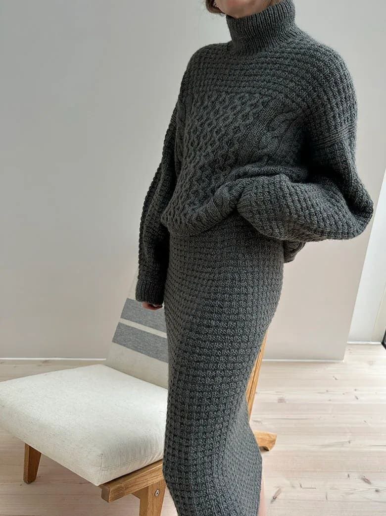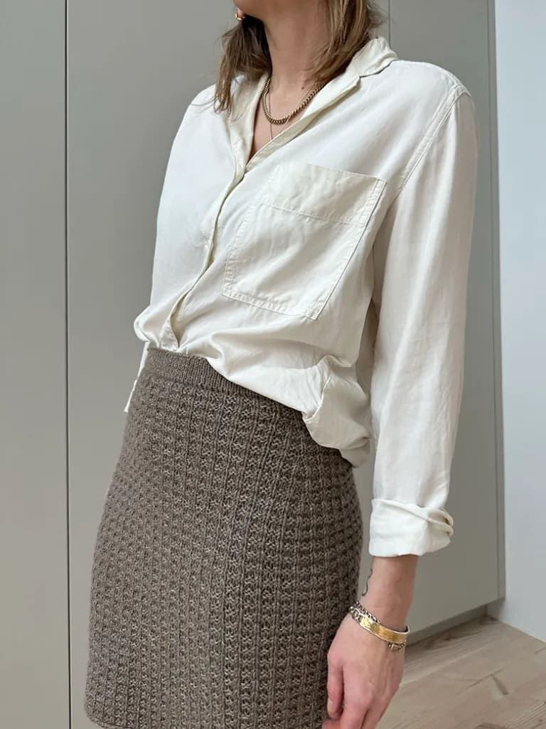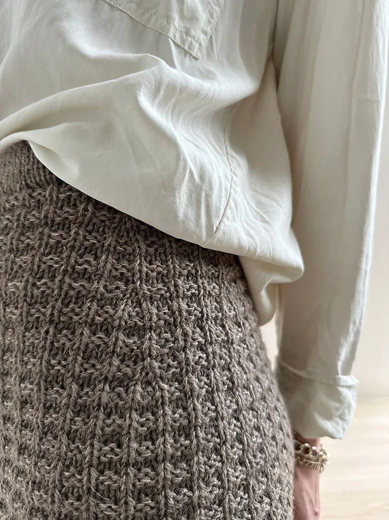 Модель представляет собой юбку с вафельным текстурным узором, завышенной талией и прямым силуэтом. Описание включает в себя варианты 2-х разных длин. Юбка вяжется сверху вниз. Пояс вяжется по кругу лицевой гладью. Затем он складывается пополам и юбка вяжется вниз. Отсюда начинается вязание вафельным текстурным узором, и укороченными рядами ряды, чтобы удлинить заднюю часть относительно передней. Затем юбка вяжется вафельным узором по кругу с прибавками для бедер с обеих сторон.