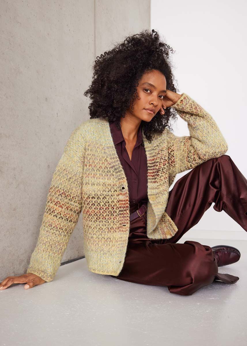 Данный жакет станет универсальной вещью в вашем гардеробе. Модель выполнена спицами из меланжевой пряжи с красивыми переходами оттенков, которые создают живую текстуру и эффект глубины. Благодаря классическому крою и аккуратной посадке жакет легко сочетать как с повседневными образами, так и с более элегантной одеждой. Свободный силуэт, мягкая фактура и удобная длина делают эту модель идеальной для прохладных дней. Жакет можно носить поверх рубашки, платья или базового топа, он добавит образу уюта и стильной небрежности.