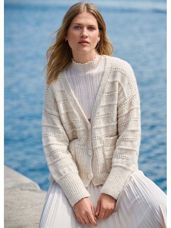 Жакет вяжется отдельными деталями снизу вверх, затем выполняются швы и детали соединяются. Планка застежки вяжется двойной резинкой вместе с полочкой и после плеча до середины выреза горловины спинки. После выполнения швов жакета короткие стороны планок соединяются, планка притачивается к вырезу горловины спинки. Посередине каждой полочки пришивается карман.