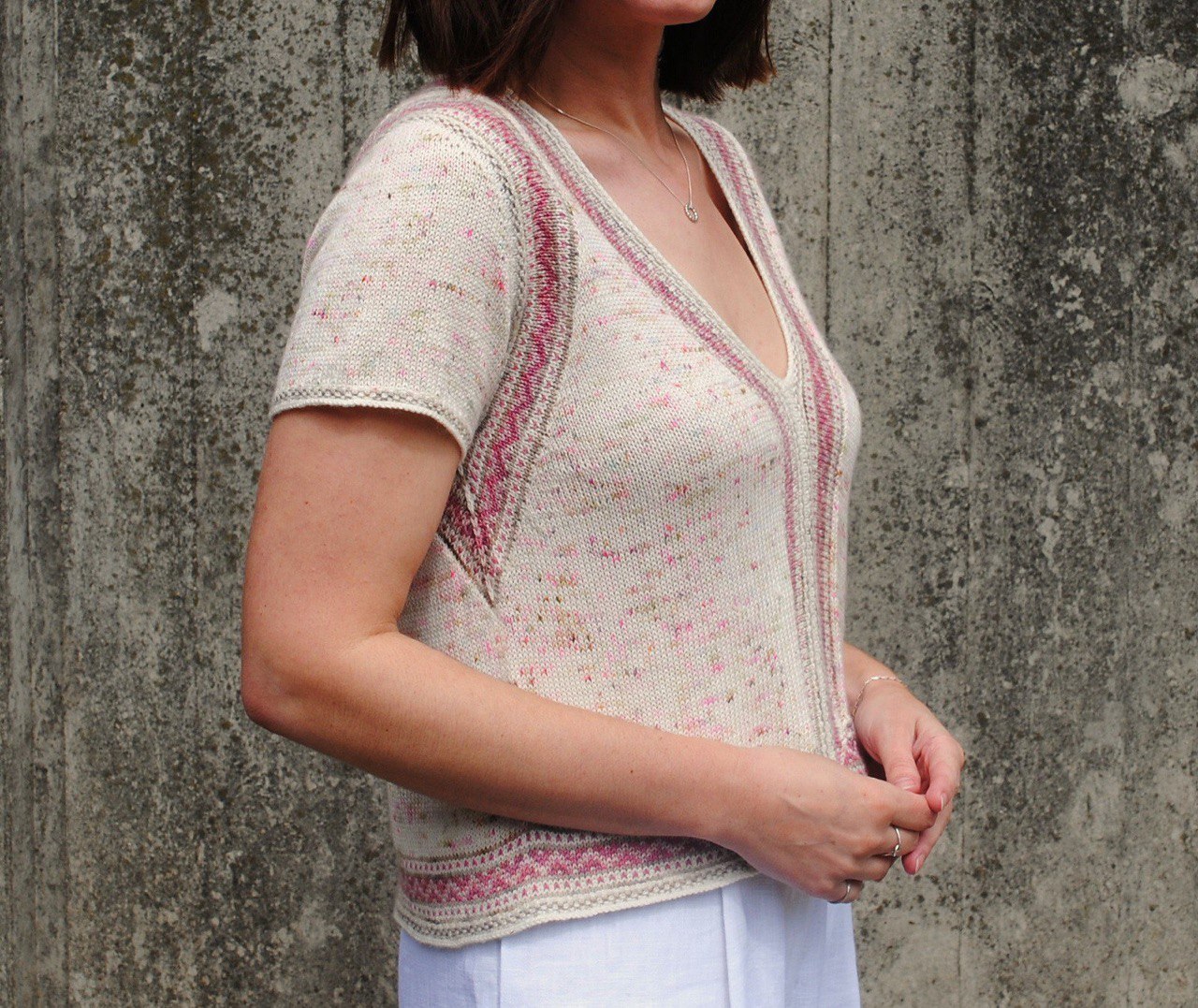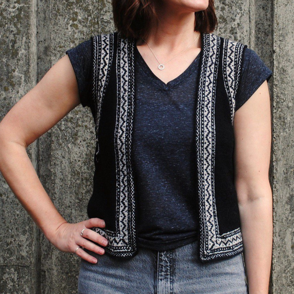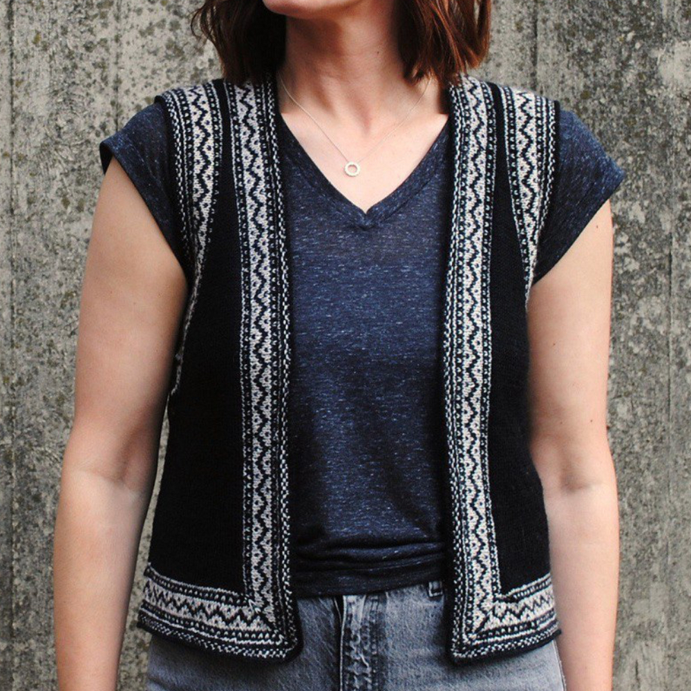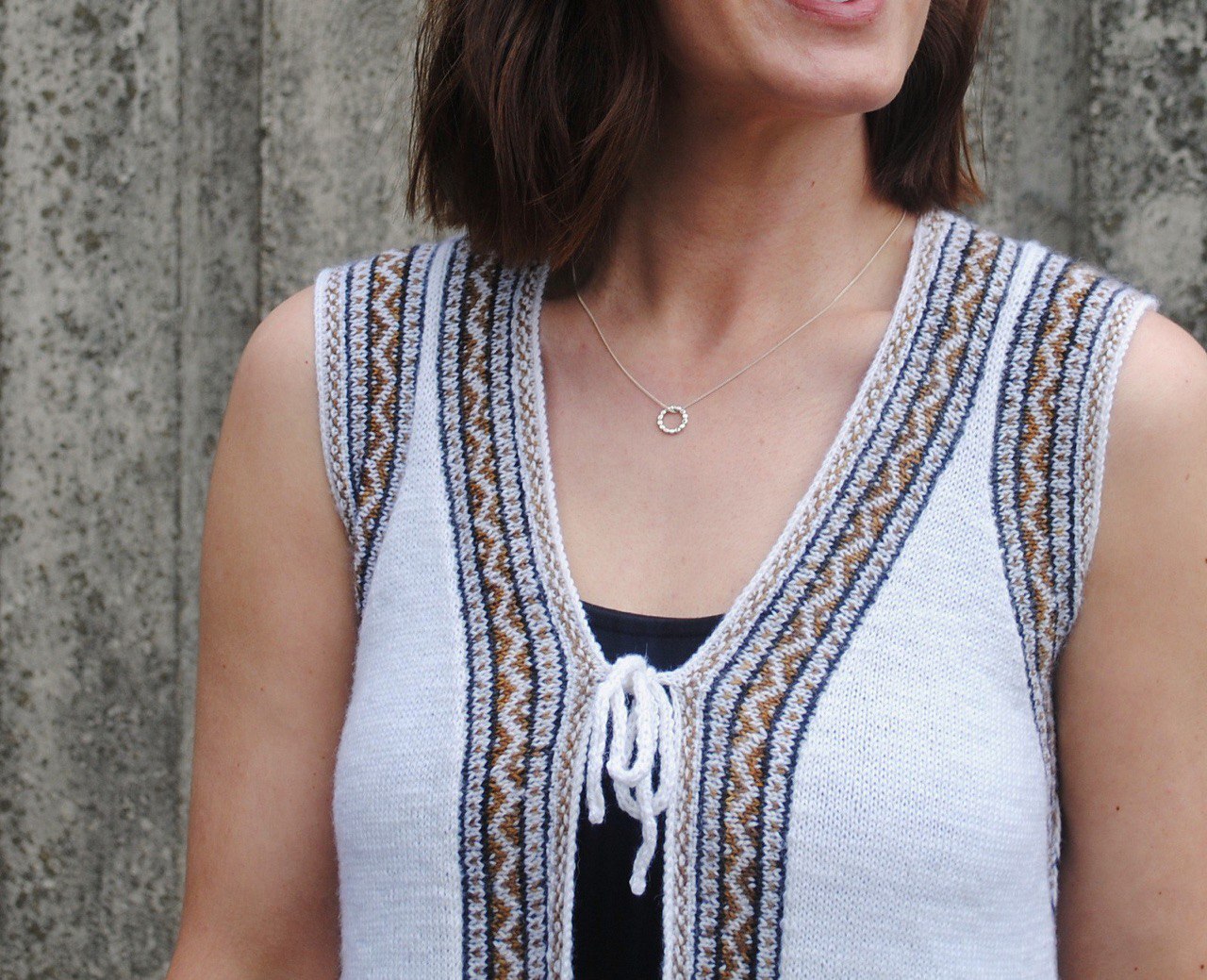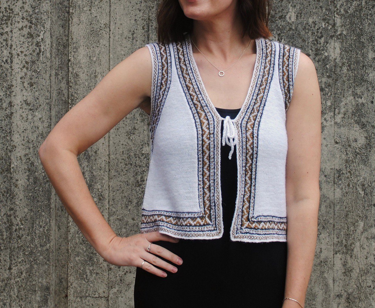 Folk - это простой, но при этом привлекающий внимание дизайн распашного жилета, или жилета на завязках с акцентом на нежный жаккардовый узор по кромкам деталей. Эту модель можно связать в трех вариантах.